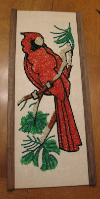 So I picked up an unused vintage gravel art kit on etsy.com and I whipped it up with a quickness! Gravel art was popular on the heels of paint-by-number kits. Basically, the kit has an outline, you fill in the glue and sprinkle on the “gravel” or beads or whatever. Then you let it dry and shake off the excess.