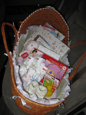 This is a gift basket I put together for my friend. Cute stuff! It includes a Moses Basket, Glow Worm, Duckie, booties, and a few little pieces of clothes.