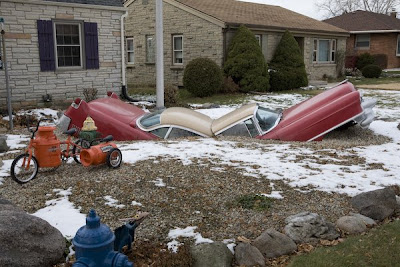 This is the front yard. Imagine us just driving by and seeing what appears to be a classic car in a sink hole! There was also an odd collection of brightly colored fire hydrants and all kinds of random things–like the orange jug/bicycle thing.